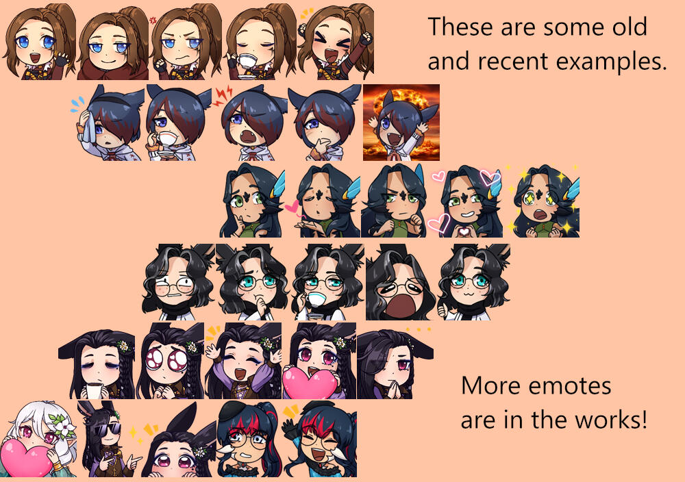 $30 USD for animated emotes. These may not be selected in the 5 emote packs. Examples would be: pat emotes, starry eyes, bongocat, etc. If you're asking for a complicated emote, that will be case-by-case basis.Temporarily closed, will open after I finish other commissions.You can ask for emotes that aren't seen in the examples above, just be sure to send me a reference.